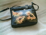 2006zwarte leren handtas met handbeschilderde tyvek papieren versiering in goud-bruin