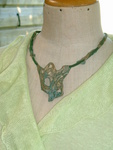 2006enkelvoudig halssieraad van handbeschilderd katoenpapier op metaaldraad in groen- en goudtinten; lengte variabel