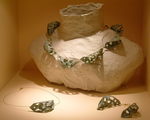 De sieraden van handgeschept papier krijgen hun stevigheid door het metaaldraad dat als ondergrond dient. De verf geeft ze een sprookjesachtige glans. Tyvek is een papiersoort waarin plastic is verwerkt. Het leent zich prima voor het ontwerpen en maken van broches en voor het aanbrengen van versieringen op kleding en accessoires zoals handtassen